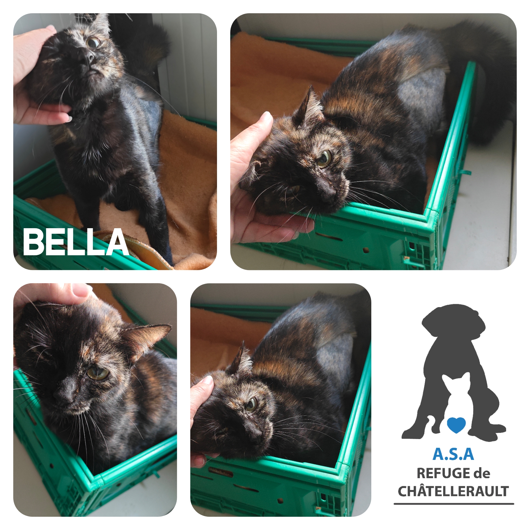 Belle a été prise en charge le 14/08 suite au décès de son propriétaire, sans famille et amis, elle n'a pu être replacée et nous l'avons accueilli. Complètement traumatisée à son arrivée, elle aura mis quasi 3 semaines avant de nous faire confiance. De jour en jour elle progresse et apprécie de plus en plus les caresses et les petites gratouilles. Bella vivait uniquement en intérieur et une vie en extérieur pour le moment ne sera pas adaptée au vu de son stress envers le monde qui l'entoure. Une nouvelle vie très calme sera obligatoire au tout début pour accueillir la miss, qu'elle puisse vous découvrir, découvrir son environnement et apprendre à vous connaitre. Comme pour toute adoption d'un nouveau chat au sein de votre famille, il faudra être patient, lui laisser le temps de tout découvrir à son rythme. Nous conseillons très fortement de ne pas sortir en extérieur votre nouveau chaton tant qu'il n'est pas castré ou stérilisé ou OBLIGATOIREMENT AVEC SURVEILLANCE sous peine de ne jamais le revoir s'il venait à s'échapper ou prendre peur.