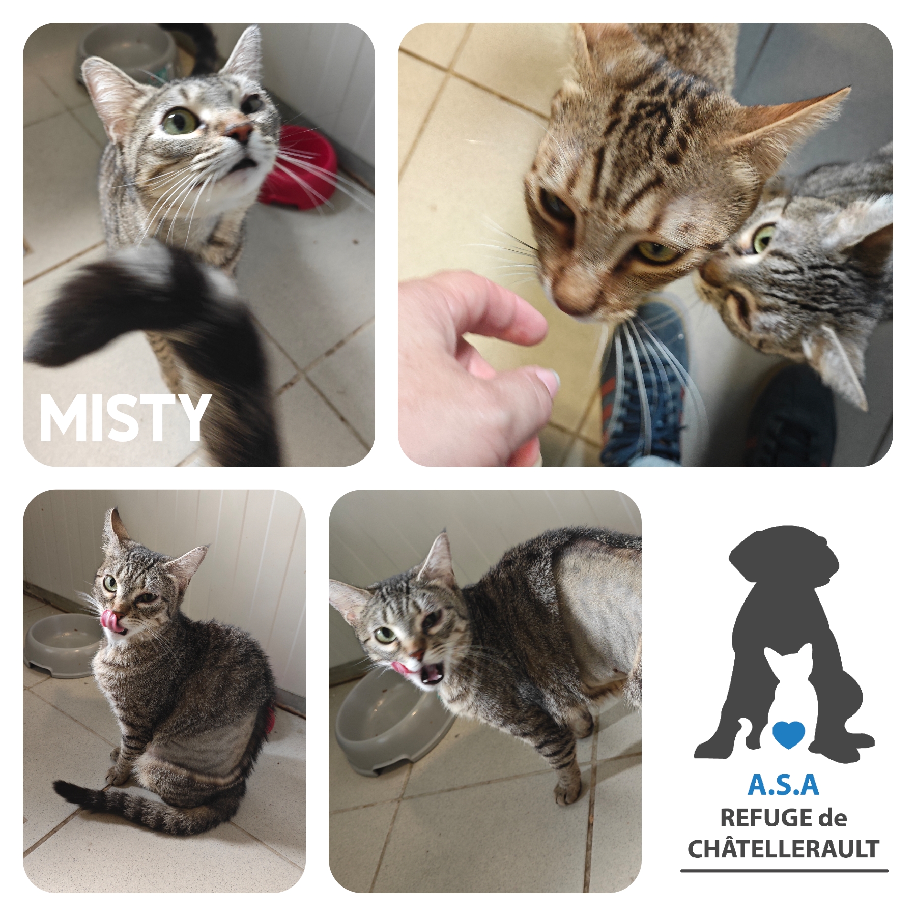 Misty a été pris en charge avec son "frère ou copain" après l'explosion du logement de son propriétaire sur Châtellerault. Pris en charge par la fourrière puis le refuge, ils ont été mis en règle, ils sont donc identifiés, vaccinés, stérilisés.... Misty est vraiment adorable et câline et Loukoum est beaucoup plus à l'aise depuis qu'ils sont à nouveau ensemble dans le même box. Loukoum est arrivé chez nous un peu survolté et un peu excessif dans ses sentiments à notre égard et une fois remis avec sa sœur il s'est totalement apaisé et n'attaquait plus nos jambes ou bras. Nous pensons donc qu'une adoption en duo avec sa sœur sera un réel besoin pour lui . Ils sont tous les deux hyper sympas, et super câlins. Comme pour toute adoption d'un nouveau chat au sein de votre famille, il faudra être patient, lui laisser le temps de tout découvrir à son rythme. Nous conseillons très fortement de ne pas sortir en extérieur votre nouveau chaton tant qu'il n'est pas castré ou stérilisé ou OBLIGATOIREMENT AVEC SURVEILLANCE sous peine de ne jamais le revoir s'il venait à s'échapper ou prendre peur.